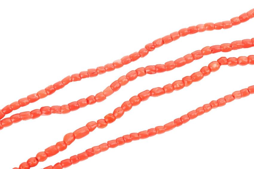 A precious coral (corallium rubrum) beaded necklace, composed of two strands of red coral beads, sizing from 2.5-3.0 mm, with two oval intervals in yellow metal testing as 18ct, overall length 102.0 cm, 30.0 grams.