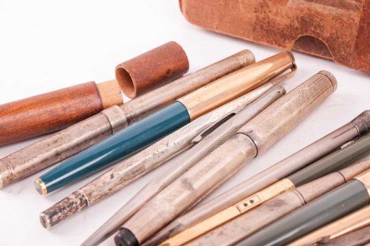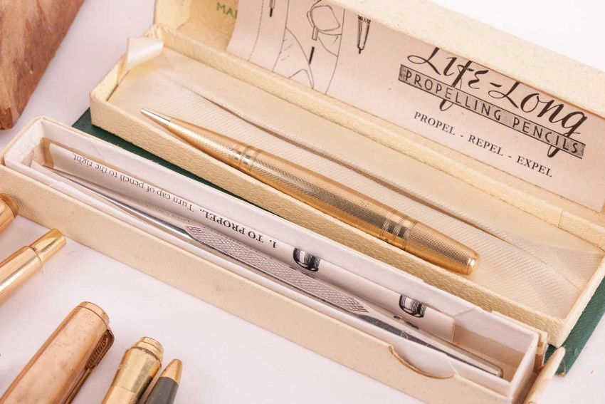 A large group of Parker pens and other mechanical pencils and pens, comprising four rolled gold capped Parker fountain pens, four rolled gold propelling pencils, twelve silver and white metal pens and pencils and four further pens and pencils, two cased. (23)