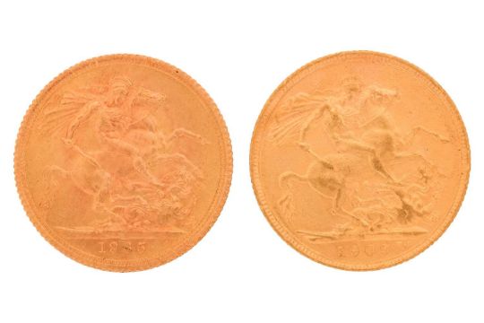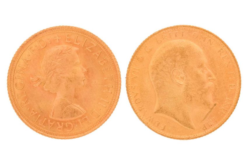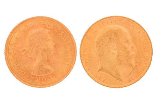 Two gold sovereign coins, including an Edwardian 1909 and an Elizabeth II 1965 coin, 16 grams, 21 mm diameter.
