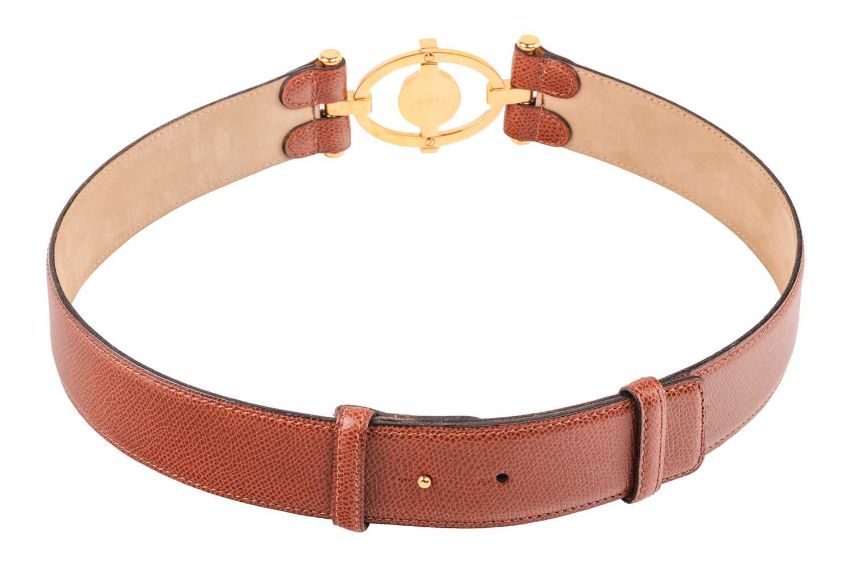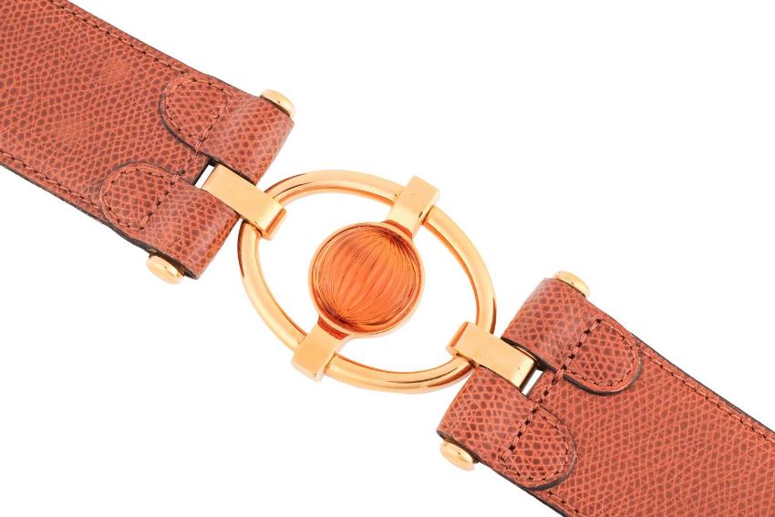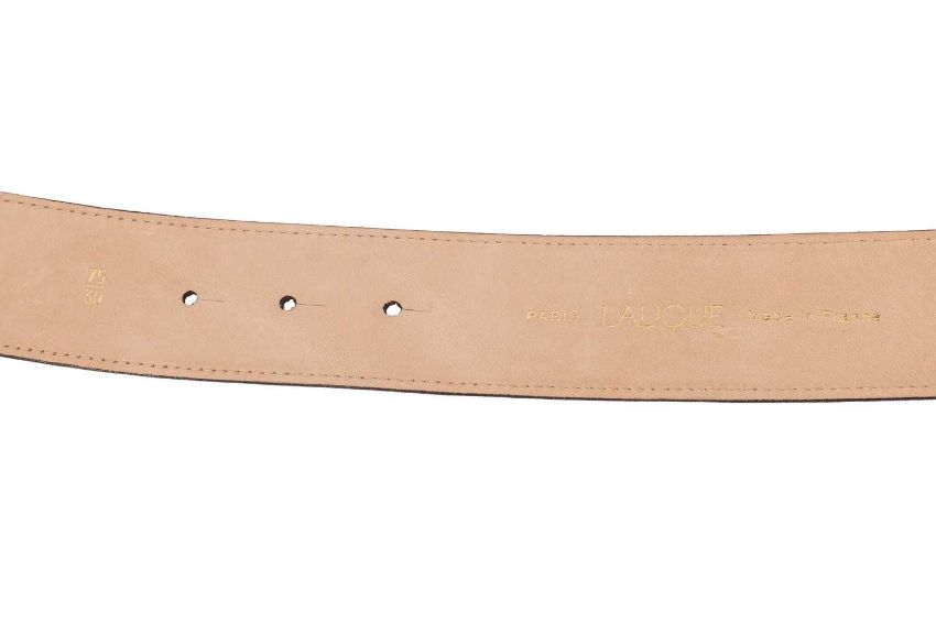 Lalique - a caviar leather belt, with the oval gilt buckle centred with a melon glass orb, signed and marked length as '75/30'.