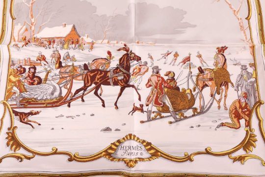 Hermès - 'Les Plaisirs du Froid (pleasure of the cold)' silk square scarf in white and brown colourway, illustrated with skaters on a lake, designed by Hugo Grygkar in 1953, rolled hem, cased. Approximately measurement 88 cm.