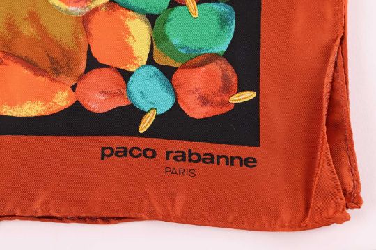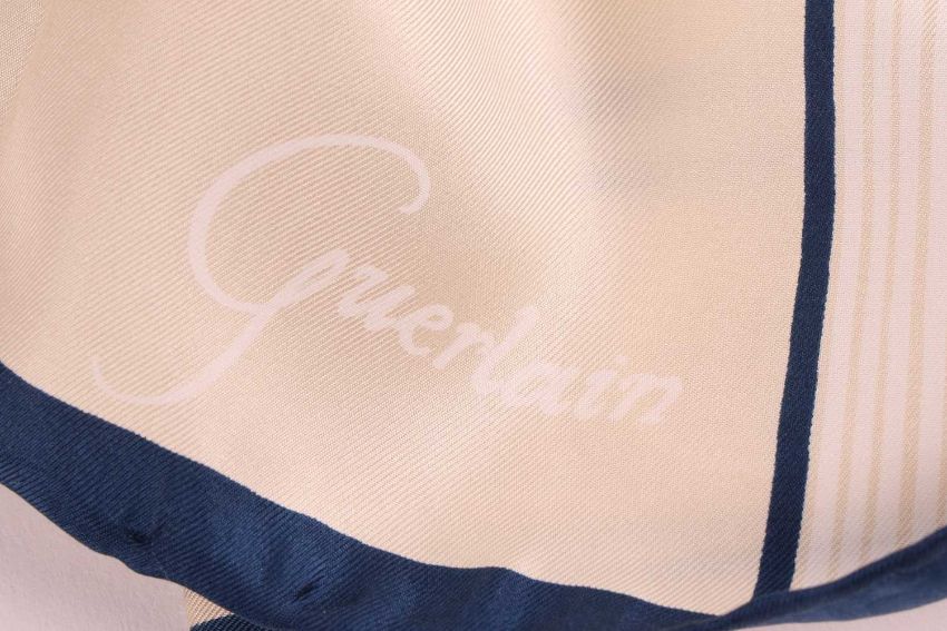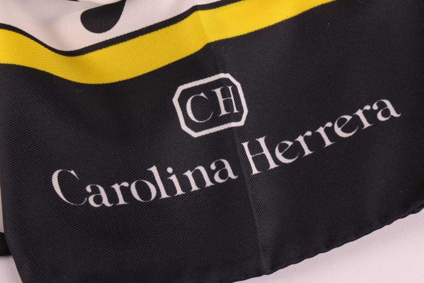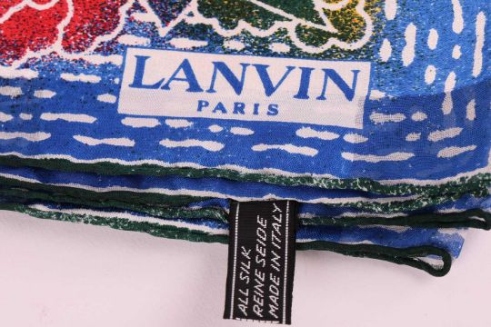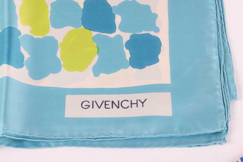 A collection of six designer square scarves; to include a Lanvin floral printed silk scarf, a Givenchy blue and green silk scarf, a Parco Rabanne fruits printed silk scarf in original packaging, a polychromatic Liberty scarf, a Guerlain scarf and a Carolina Herrera polka dots scarf in polyester. (6)