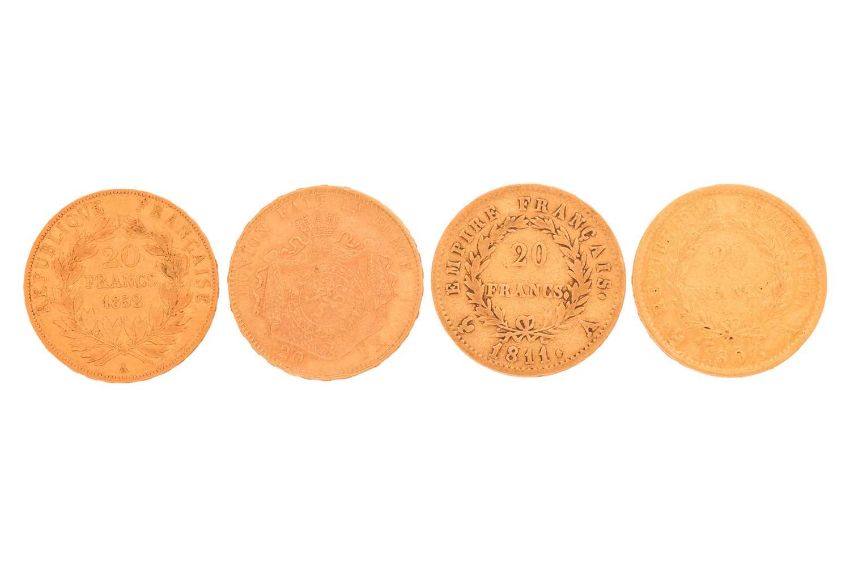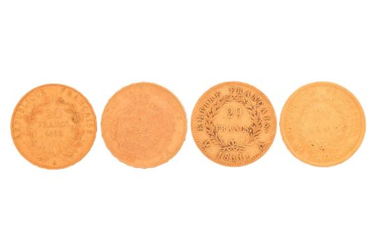A collection of four French (Republique Francaise) twenty franc gold coins, including,1807,1811, 1852 and 1875, 25.5 grams combined weight