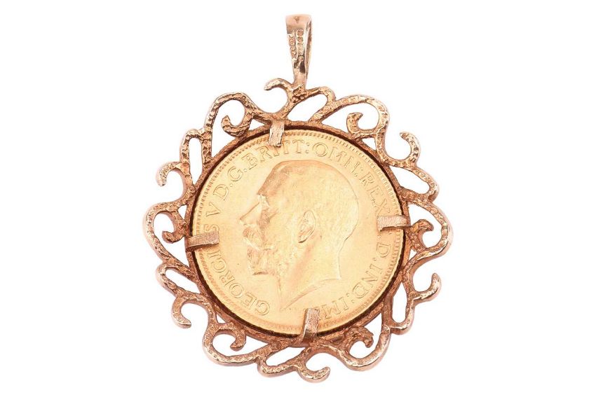 A George V 1913 full sovereign in a detachable cast scrolled pendant mount, with integral bail, in 9ct yellow gold, 12.6 grams.