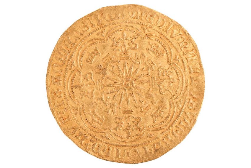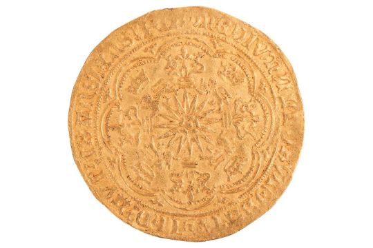 The Flemish imitations of the English Edward IV gold ryals are well known although not always easy to spot from their originals. This particular specimen is identified by the weight, a good 0.2g less than the English examples and certain stylistic traits such as the elongated sword on the obverse and the king’s wide face. For an in depth description of Flemish imitation of Edward IV ryals and their significance to British and European numismatics see by Anthony Thompson in the British Numismatics Journal 1945. Continental imitations of the rose noble of Edward IV"