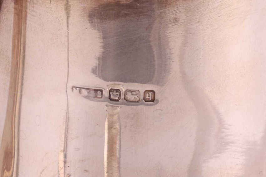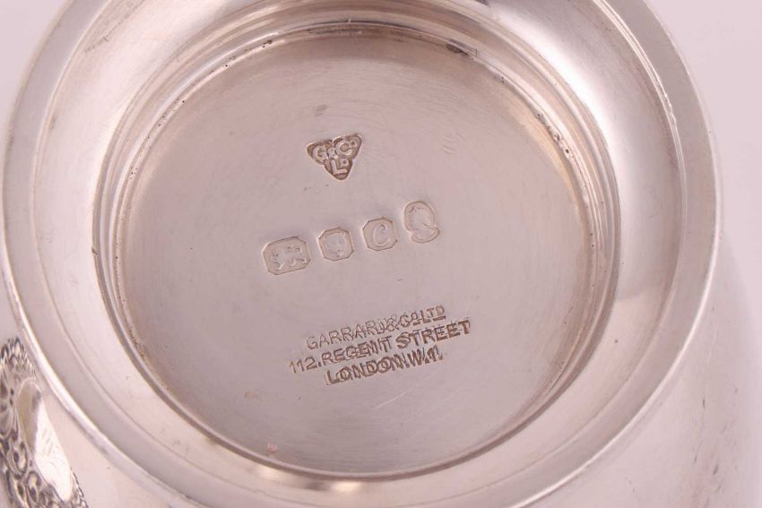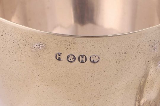 An Edwardian silver conical hot water jug, Sheffield 1908 by John Grinsell & Sons; a Garrard & Co silver punch cup, a Tiffany silver plated pin dish, and a Hukin & Heath silver plated goblet. 13 ozt, 426 grams combined weight.