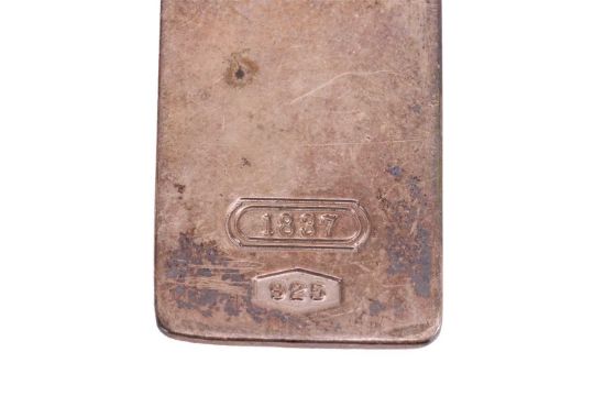 Tiffany & Co. - an initial pendant on a 41.0 cm long fine cable link chain in white metal marked 'Ag 925', an infinity sign necklace on cable link chain in white metal marked 'Ag 925' measuring 45.0 cm long, and an 1837 money clip stamped '925'; total weight of items 29.6 grams. (3)
