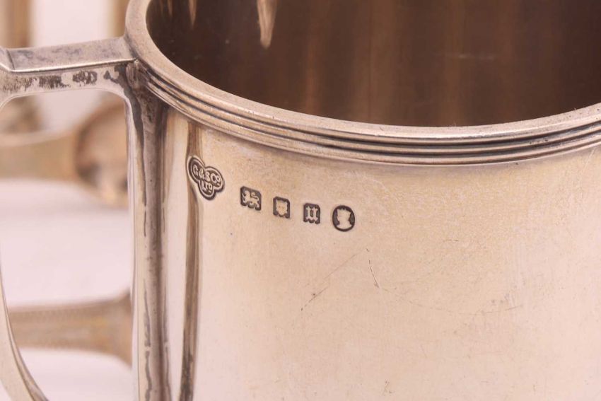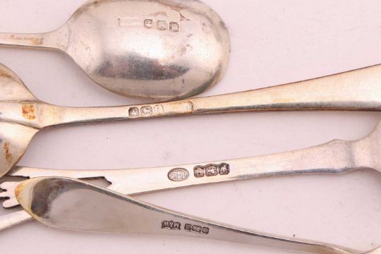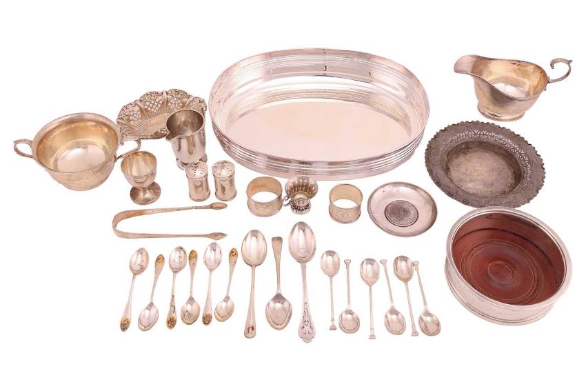 A collection of small silver items, including a cased set of silver and silver gilt teaspoons, Sheffield, a wine coaster, cruets, sauce boat and others, together with a large boxed silver plated tray; total weighable: 29.7ozt, 926.0 grams