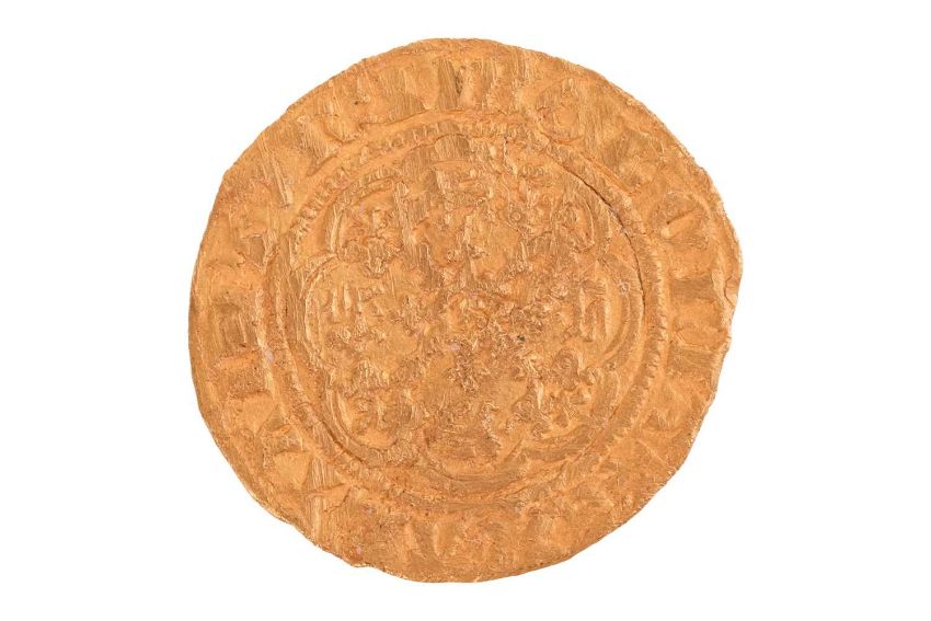 An Edward III hammered gold "Noble" coin 1.8 grams, 19 mm irregular diameter.