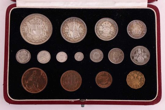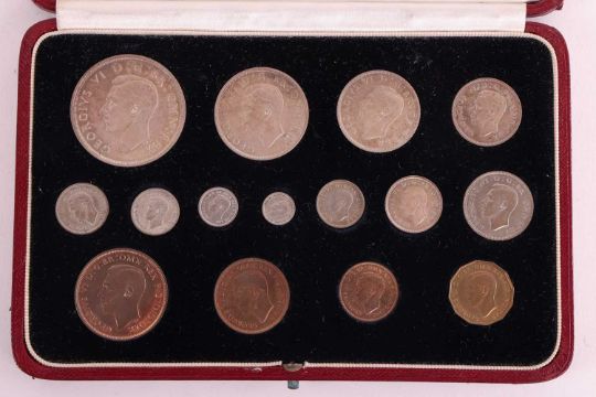 A King George VI, 1937, fifteen specimen coin set, including Maundy money, in a fitted gilt tooled red Morocco leather snap case, 18.6 cm wide, the case.