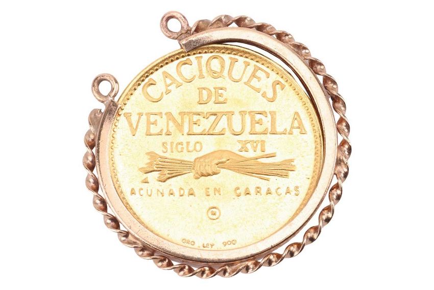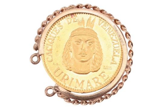 A Venezuelan Caciques Urimare coin token in pendant mount, commemorating Venezuelan Indian chiefs, stamped 'Oro 900', in a detachable 9ct gold mount with twisted cable border, 5.7 grams.