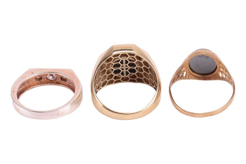Three gents rings; comprising a hematite intaglio ring, in a 9ct gold mount, size V, 2.9 grams, a hexagonal onyx-set dress ring in a 9ct gold mount, size V, 4.4 grams, a cubic zirconia-set ring, in a white metal marked '925', size S, 6.5 grams (3)