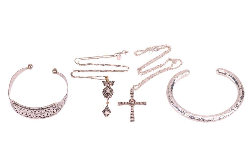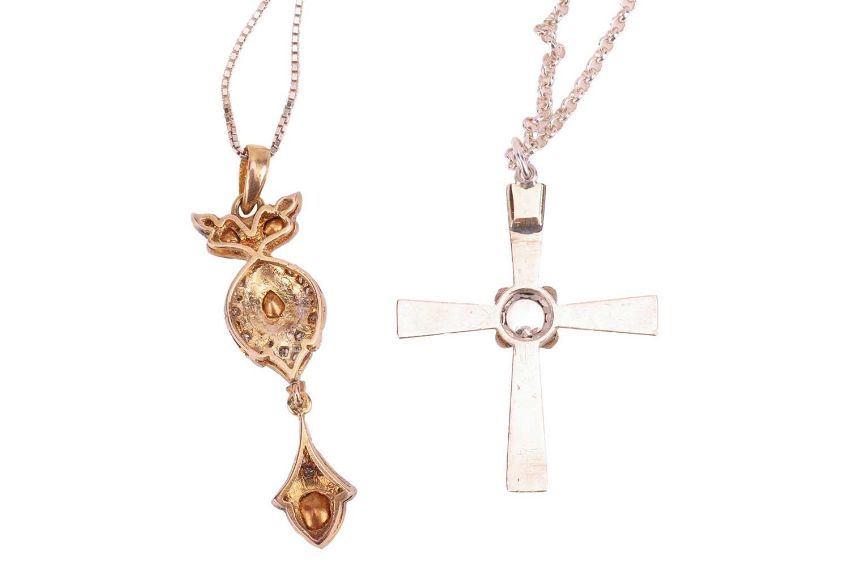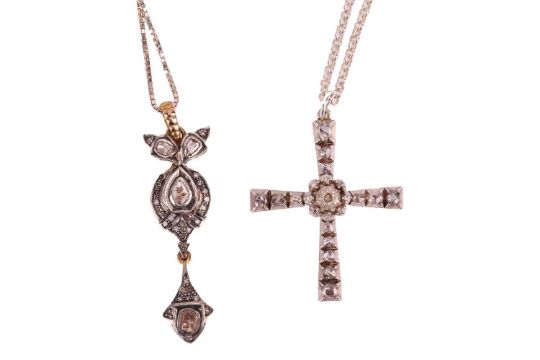 A small group of jewellery items; comprising a diamond-set cross pendant, set with rose-cut diamonds, the central diamond deficient, in a bi-metal mount tested as silver and 9ct gold, together with a diamond-set drop pendant, in bi-metal tested as silver and 9ct gold, and two silver cuffs; 111.9 grams (4)