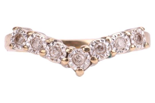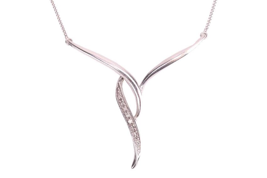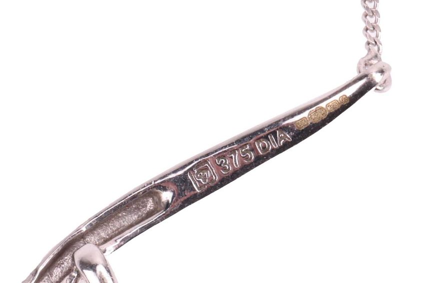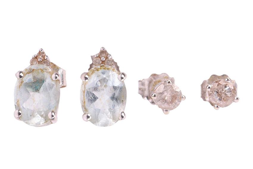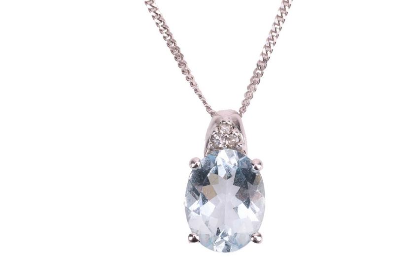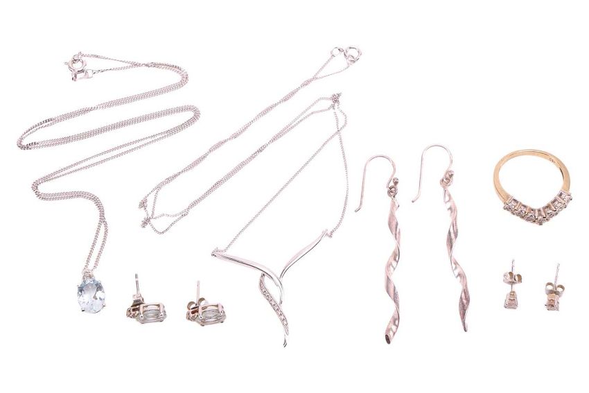 A group of jewellery, to include a 9ct gold ring illusion-set with seven diamonds, size M, 2.33 grams; a pair of 9ct white gold diamond-stud earrings, to post fittings with butterfly backs, 0.52 grams; A diamond set pendant on chain in 9ct white gold, 46.5cm in length 2.0 grams; An aquamarine and diamond pendant on chain in 9ct white gold, 14.5cm in length, 2.3 grams, with matching ear studs marked ‘375’, 1.4 grams; A pair of spiral drop earrings marked ‘925’, 2.5 grams.