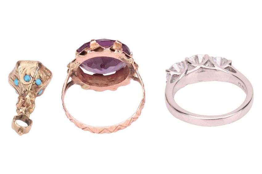 A small group of jewellery items comprising a CZ-set three stone ring, in a platinum mount, size M1/2, a synthetic colour-change sapphire ring, in a yellow metal mount with Egyptian hallmarks for 12ct gold, size O, and a gem-set fob seal in a base metal mount; total weighable: 10.5 grams (3)