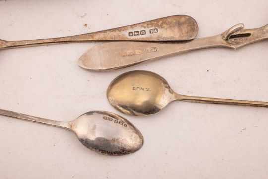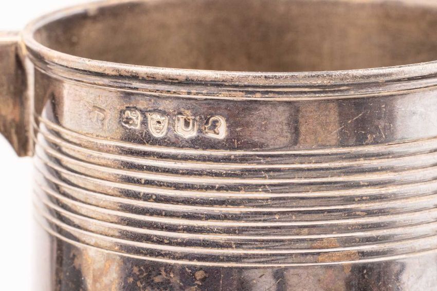 A George III mug, tapering cylindrical with reeded bands and angled handle, London 1795, maker's mark obscure. 9cm high; together with a cased Victorian Christening mug in fitted case, baluster form, the foliate engraved body with roundels, one with commemorative engraving, on a spreading circular foot, leaf-capped scroll handle and gilded interior, Edinburgh 1865 by Mackay, Cunningham and Co. 11.4cm high; a Victorian cream jug, London 1871 by Henry Wilkinson; a Victorian silver drum mustard in Gothic taste, with a blue glass liner (damaged); a set of coffee spoons with enamelled handles; a cased three-piece condiment set, a preserve spoon; a cased silver Christening spoon and a set of silver plated bean end coffee spoons. Gross weight 968 grams (31ozt)