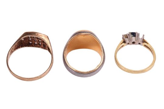 A collection of jewellery, to include a sapphire and diamond ring in 18ct yellow gold (one diamond deficient), size N, 3.06 grams; A 9ct gold ‘S’ pendant, 1.25 grams; A 9ct gold Star of David pendant, 9.88 grams, on chain surface testing as 9ct, 9.63 grams, 64.5cm in length; A pair of 9ct gold tri-colour earrings, to post fittings, 2.66 grams; A silver heart shaped locket, 10.92 grams, a 9ct gold panel ring, grain set with cubic zirconia, size U, 3.5 grams; A wrist watch, case marked ‘18K’, strap marked ‘9K’, 11.6 grams; As well as other examples of costume jewellery and a silver-gilt medal from the Royal Masonic Institute for Girls.