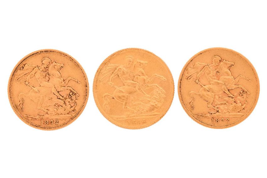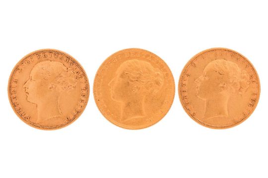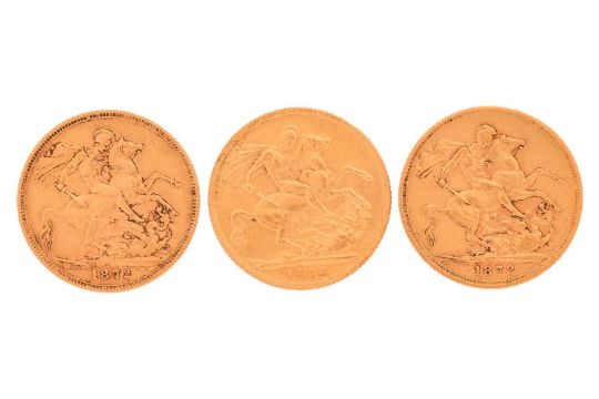 Three "Young Head" Victorian gold sovereign coins, including two 1872 and 1886 (Melbourne Mint), 23.9 grams combined weight, 21 mm diameter.