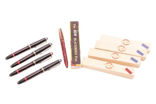A collection of five cased ink pens: four Rotring Tiku specials with the Red Ring; together with one The New Blackbird Pen by Mavis, Todd & Co Ltd. (5)