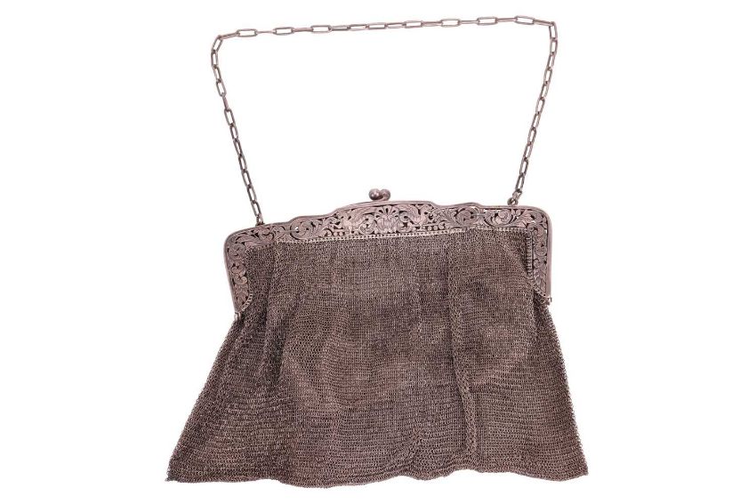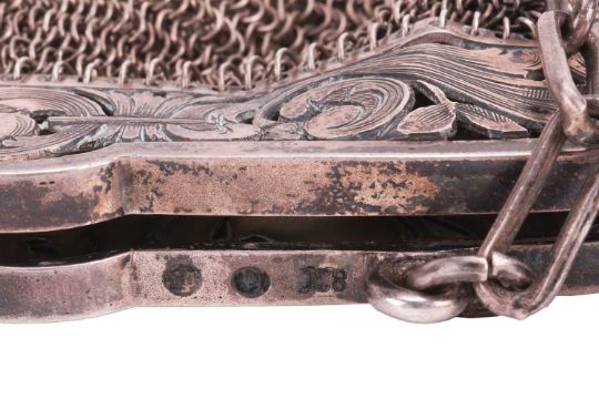 A late 19th-century, possibly Norwegian (830) lady's silver mesh evening bag, with chain and snap top, pierced and engraved with opposing wyvern, bearing marks to frame for 830 but probably sterling.10 ozt, 317 grams, 17.5 cm wide.