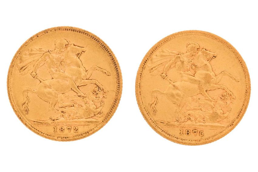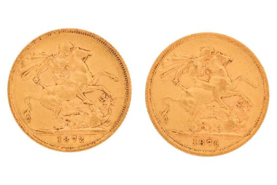 Two "Young Head" Victorian sovereign coins, 1872, 1875 (Melbourne Mint), 15.9 combined weight, 21 mm diameter.