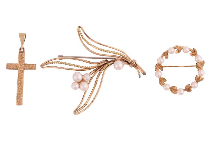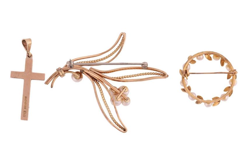 A pendant and two brooches; to include a 9ct gold cross pendant engraved with foliate patterns, a 9ct gold and cultured pearl wreath circular brooch, and a Krementz gilt foliate brooch set with cultured pearls; Total weight of items 11.6 grams. (3)