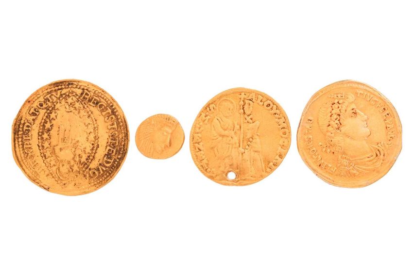 A Roman-style gold coin, together with two Venetian gold coins and a very small Roman-style Marium gold coin. 12.6 combined weight, 21 mm diameter, the largest