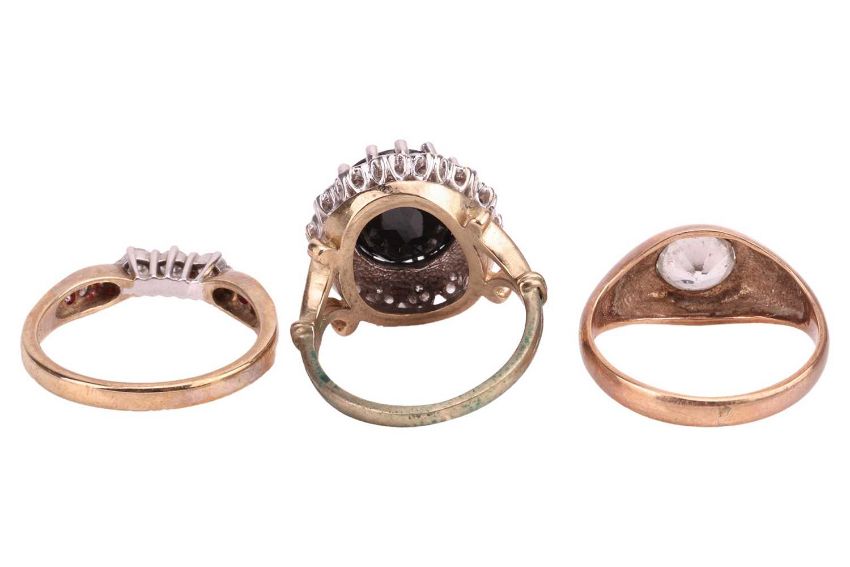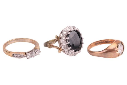 A group of three gem-set rings: The first a diamond three stone ring, comprising three claw-set round brilliant-cut diamonds, to shoulders each set with three grain-set diamonds, to a 9ct yellow gold ring shank, ring size N ½, 2.5 grams; The second a sapphire and diamond cluster ring, featuring a central oval-cut claw-set sapphire of very deep blue colour, encircled by fourteen illusion-set diamonds, to bifurcated shoulders of scrolled design, leading to a 9ct yellow gold ring shank, ring size K, 5.5 grams; The third a white sapphire gypsy ring, comprising a round-cut white sapphire to a graduating 9ct yellow gold ring shank, ring size M, 2.5 grams. (3).