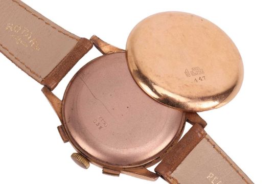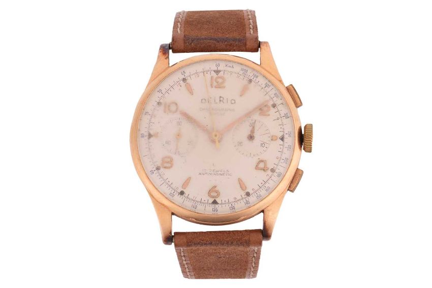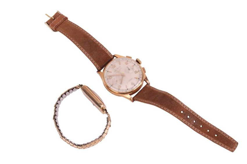 Two Wrist Watches; The first an ‘18K’ Delrio chronograph wrist watch, the 38mm case enclosing a white dial featuring baton and Arabic numerals, with a 30-minnute subsidiary dial at three o’clock and a seconds subsidiary dial at nine o’clock, featuring a Landeron calibre 151 seventeen jewel manual wind movement, to an after-market brown suede strap with a gold-plated buckle, inner circumference approximately 21.5cm at widest, 43.5 grams; The second a J. W. Benson wrist watch, the 16mm x 28mm 9ct gold case enclosing a quartered cream dial with Arabic numerals and minute track, minute-hand deficient, featuring a calibre 163 fifteen jewel manual wind movement, numbered ‘280514’, inside of case back featuring Birmingham Hallmark for 9ct gold, dated 1937, to a gold-plated after-market elasticated strap, inner circumference approximately 13cm (unstretched), 20.5 grams.
