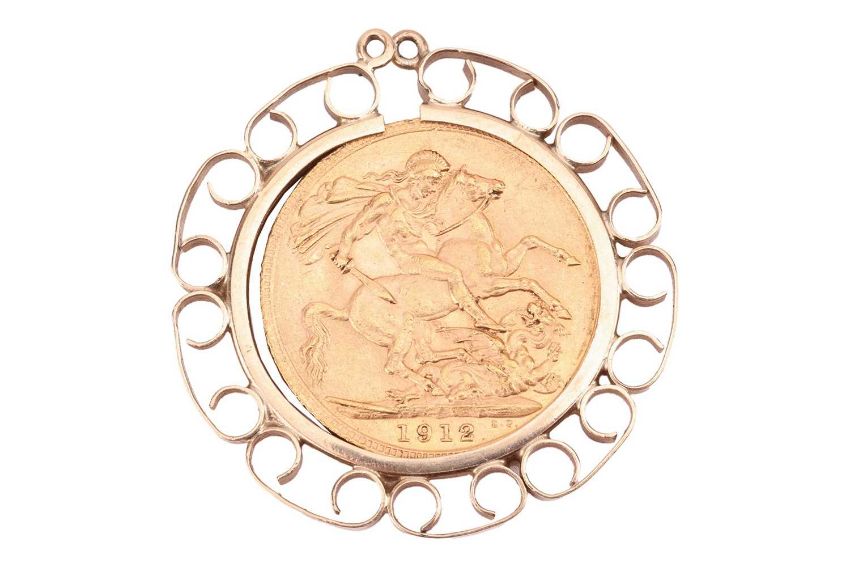 A George V 1912 full sovereign, in a 9ct gold detachable pendant mount with scrolling border, 3.2 cm wide, 10.3 grams.