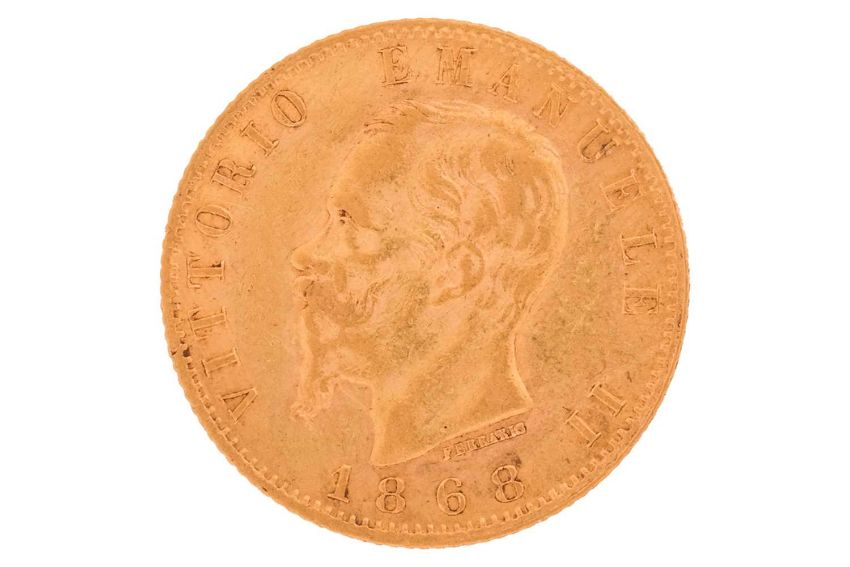 An Italian 1868 twenty lire gold coin, 6.4 grams, 20 mm diameter.