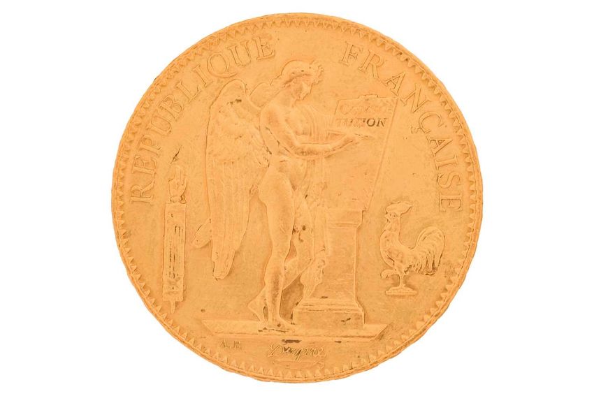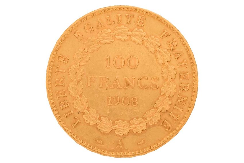 A 'Republique Francaise' 1908 French one-hundred-franc gold coin, 32.3 grams, 34 mm diameter.