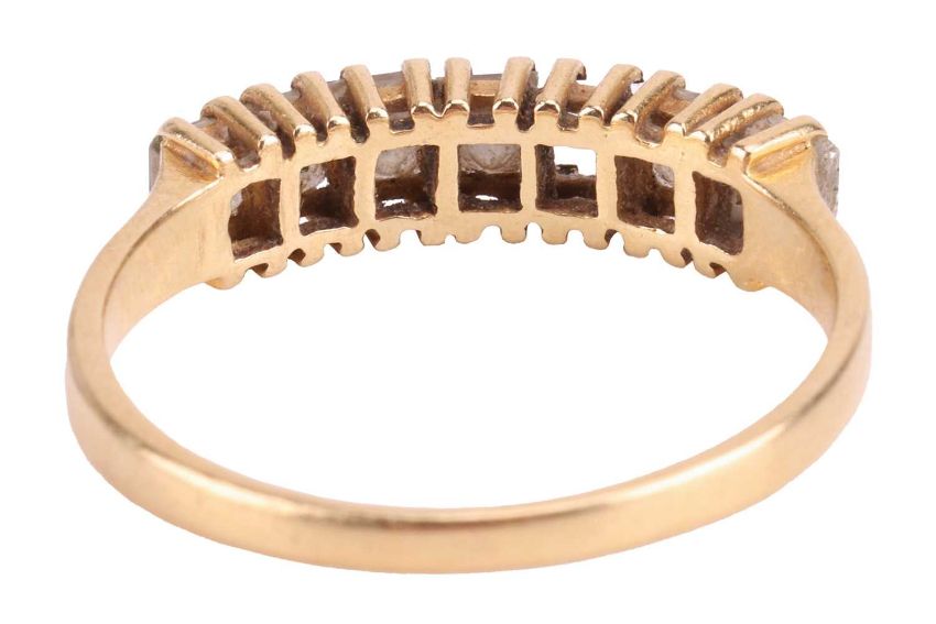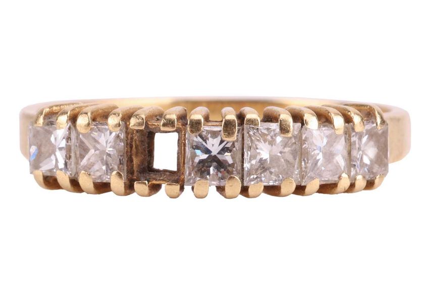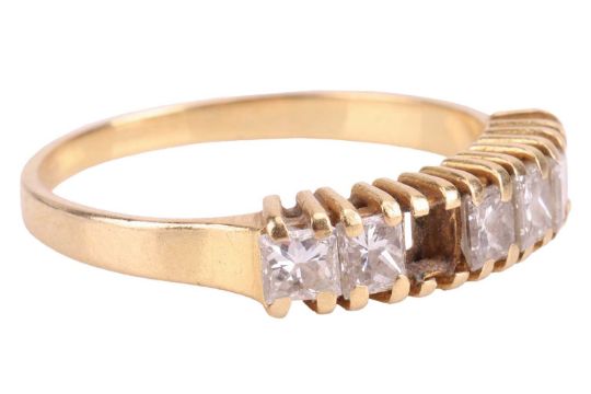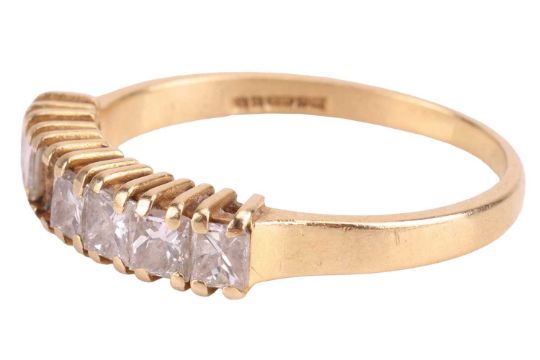 A diamond half hoop ring in 18ct yellow gold, set with a row of princess-cut diamonds with an estimated total weight of 0.70ct, one diamond deficient, to tapering flat shank, size Q, 3.0 grams.
