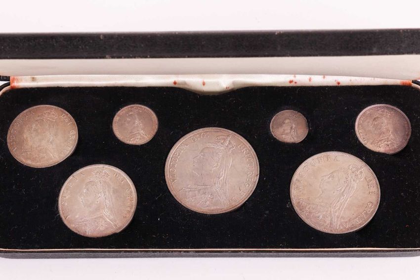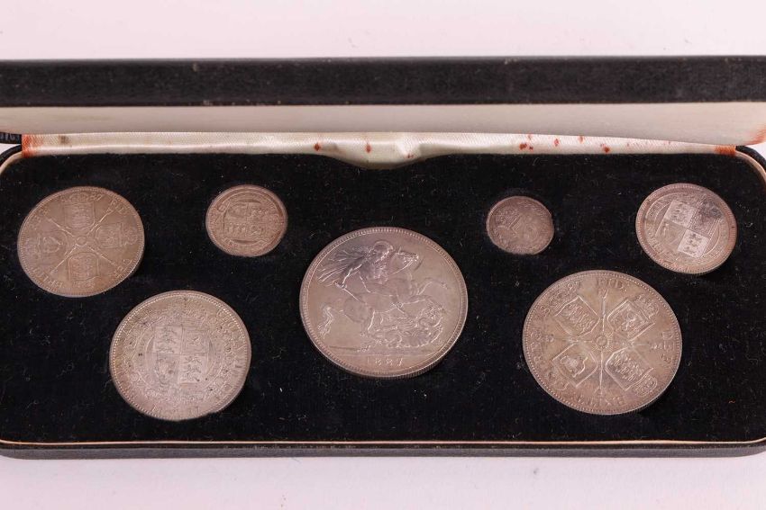 A Queen Victoria Jubilee 1887, seven specimen silver coin set, in a fitted snap presentation case. 18.5 cm long, the case.