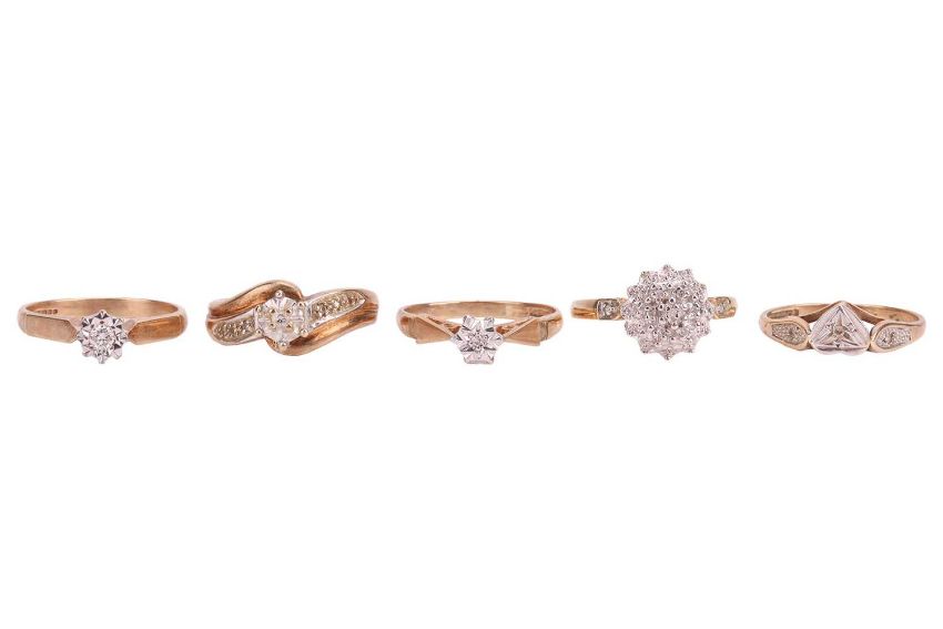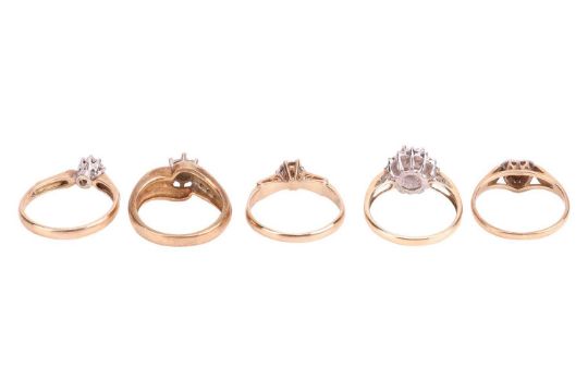 A group of five gem-set rings; The first an illusion-set diamond solitaire ring, featuring an illusion-set round brilliant-cut diamond in white metal, to a tapering 9ct yellow gold ring shank, ring size M, 2.0 grams; The second an illusion-set diamond ring of bypass design, featuring a central illusion-set round brilliant-cut diamond, flanked by shoulders each set with three single-cut white sapphires, to a tapering 9ct yellow gold ring shank, ring size J, 4.0 grams; The third an illusion-set diamond solitaire ring to tapering chenier shoulders leading to a 9ct yellow gold ring shank, ring size N, 2.0 grams; The fourth a white sapphire cluster ring, to a 9ct yellow gold ring shank, ring size L, 2.5 grams; The fifth an illusion-set diamond heart-shaped solitaire ring, to shoulders each grain-set with a single-cut white sapphire, to a 9ct yellow gold ring shank, ring size L ½. (5).