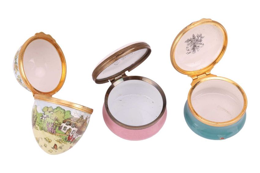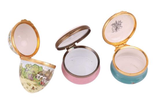 A collection of three patch boxes; one in the form of an egg, depicting a rural scene, measuring 6.0 x 4.0 cm; one of rounded form with blue enamel to the body, measuring 4.4 x 2.8 cm and another of similar design with pink enamel body colour, both with floral designs and inscriptions to lids.