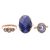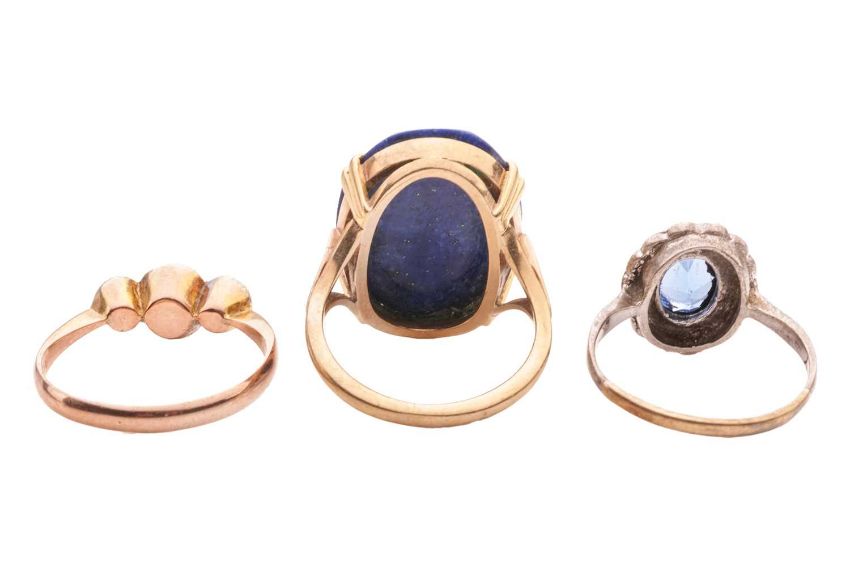 Three gem-set rings, comprising a three-stone paste-set ring, hallmarked 9ct gold, Chester 1912, size P, a paste-set cluster ring, in bi-colour metal marked '18ct & SIL', size M, and a lapis lazuli ring, in yellow metal tested as 9ct gold, size L1/2; 10.5 grams (3)