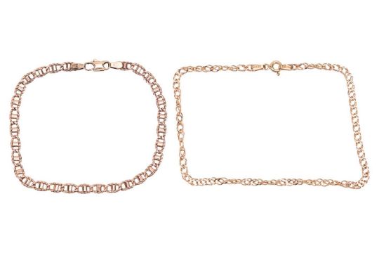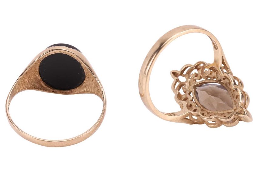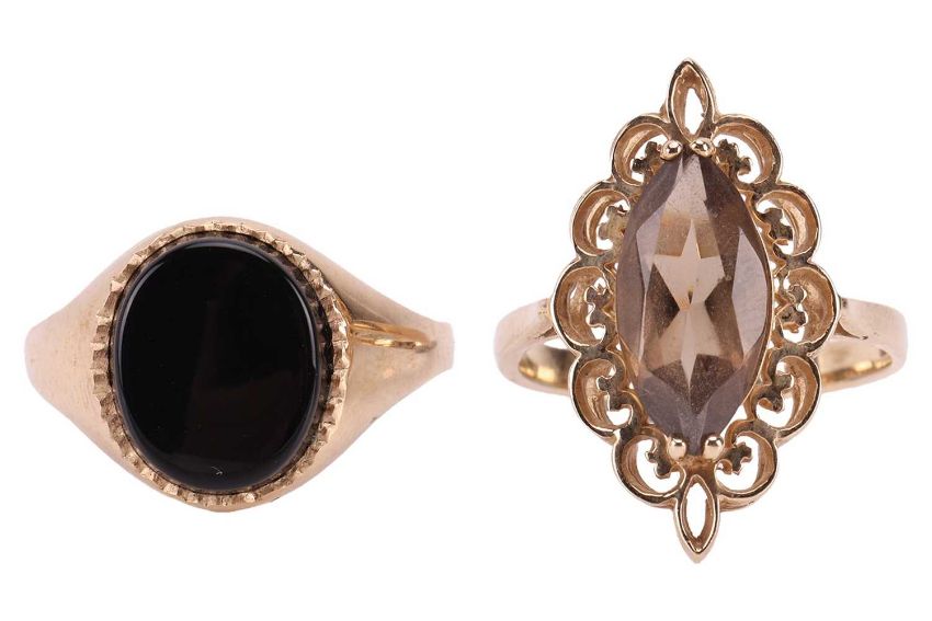 A small group of jewellery items comprising a 9ct gold onyx-set signet ring, size R, a 9ct gold smokey quartz ring, size N, a 9ct gold bracelet, and a 9ct gold rambo link bracelet; 11.9 grams (4)