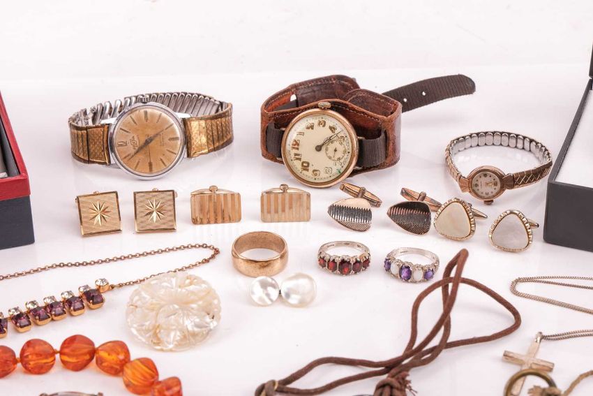 A collection of jewellery and watches to include; a 9ct wedding ring of 8.2mm, 7.5g; a 9ct amethyst and seed pearl brooch, 5.0g; a Victorian bar brooch, converted from a stick pin, featuring an Etruscan revival bosse, testing as 18ct, to a bar fitting testing as 14ct, 2.0g; an Excalibur lady's wristwatch with case back stamped "375"; a Sheffer fountain pen, two silver rings set with garnet, opal and amethyst, together with various cufflinks, costume jewellery and watches.
