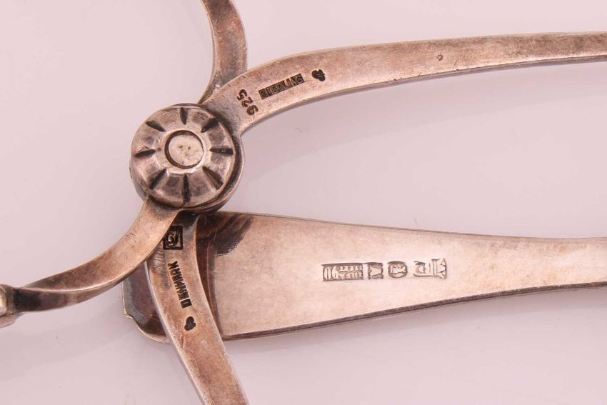 A pair of Georg Jensen silver "Blossom" pattern silver sugar bows and a Dutch white metal tray, bowl, sauce boat, spoon and tongs. 8.1 ozt / 229 grams gross weight of silver.