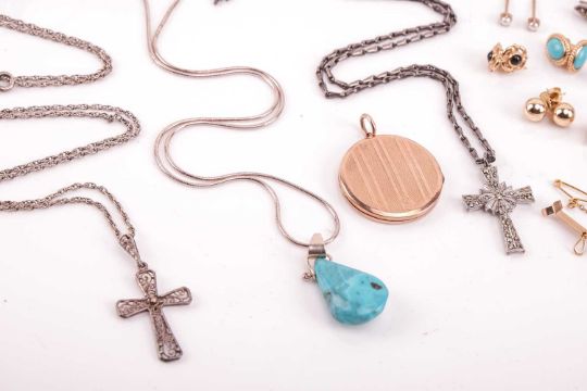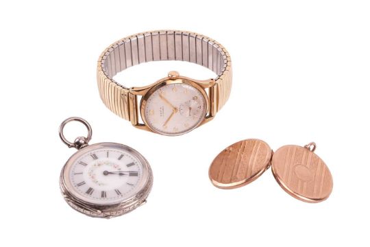 A mixed group of jewellery items comprising six silver rings, eight pairs of yellow metal earrings, the majority marked ‘375’ or ‘9ct’, additional earrings, a circular pendant locket marked ‘9ct’, an open face pocket watch, a Hefik wristwatch and other items; total weighable: 15.5 grams