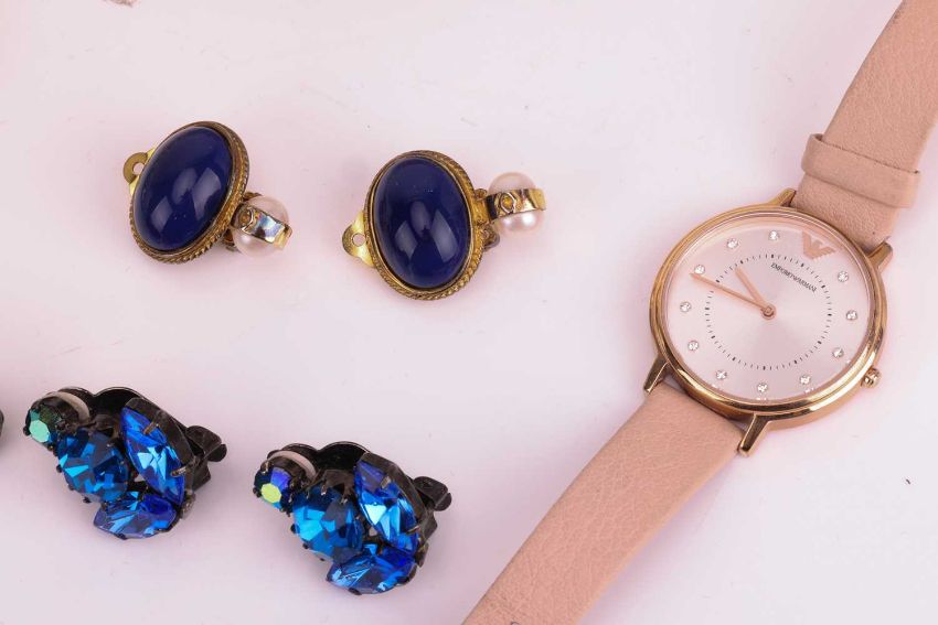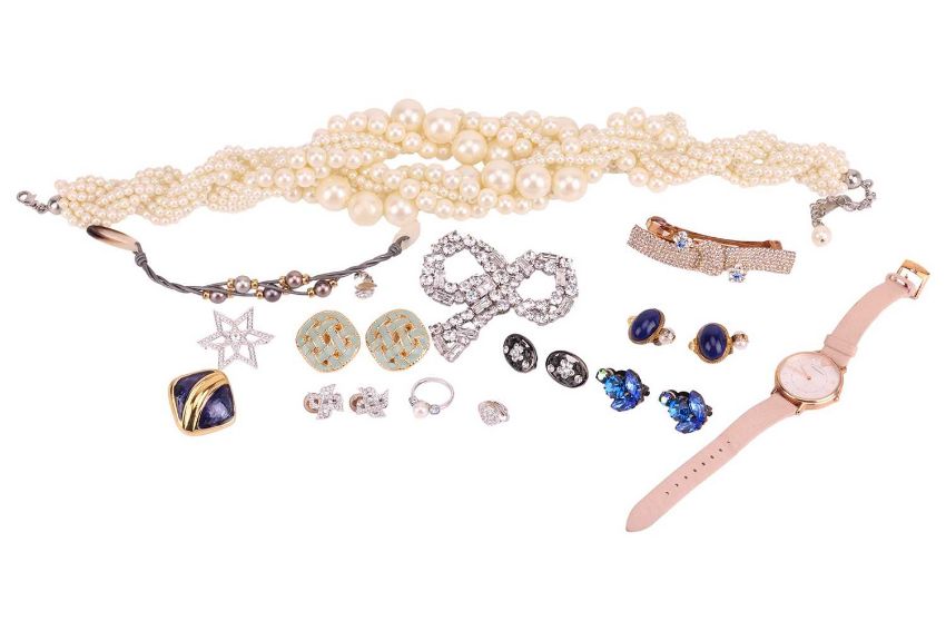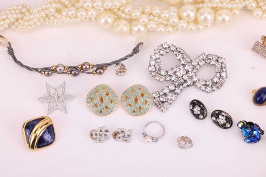 A small collection of costume jewellery to include a multi-strand faux-pearl necklace marked 'L.K.Bennett', 50cm in length; a pair of green enamel ear clips of lattice design; three pairs of cubic zirconia ear clips; two cubic zirconia brooches, along with other ear clips, bracelets and an Emporio Armani watch.