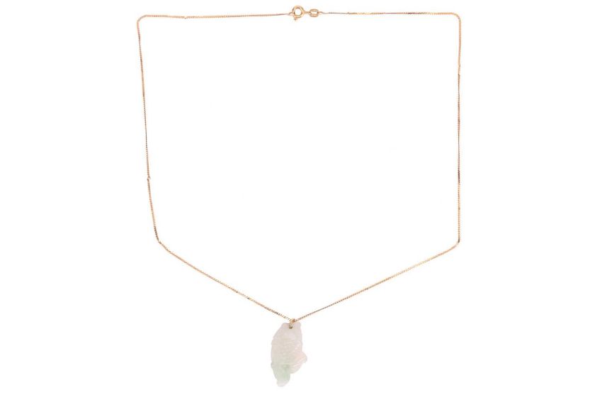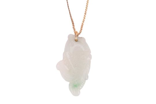 A carved jade fish pendant of pale greyish-green colour, 2.7 x 1.6 cm, on a 45.0 cm long fine serpentine link chain in 9ct yellow gold; together with a pair of three-tone earrings, fitted with earposts (bent and taped) and omega clips, stamped '750A1'; total weight of items 6.2 grams. (2)