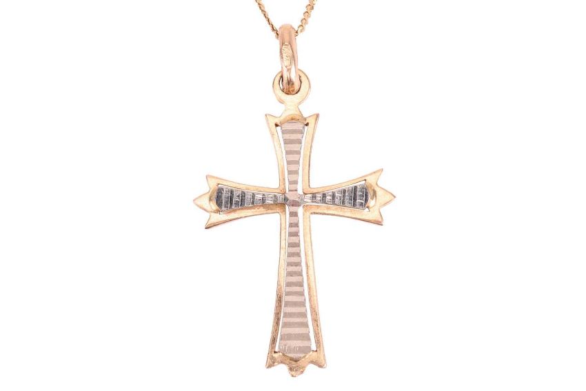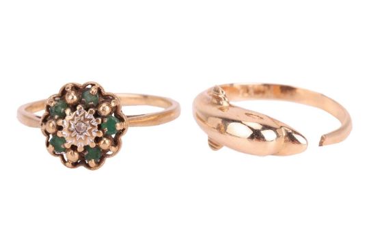 A collection of jewellery, to include a hinged bangle featuring striped and lozenge-shaped engraved detail, completed with an integral box clasp and additional safety chain, inside of bangle engraved ‘15ct’; along with a dolphin ring marked ‘K14’, size K; an emerald and diamond cluster ring, size M, surface testing as 9ct (hallmarks indistinct), an openwork ring (broken), surface testing as high carat; a pair of engraved hoop earrings surface testing as 9ct; an engraved cross pendant on chain, surface testing as 18ct, chain measuring 54.0cm in length; Gross weight 21.1 grams (6).