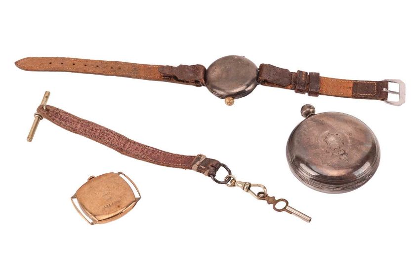 A 9ct gold cased, cushion-shaped manual wind, gentleman's wristwatch with dedicatory inscription verso with simple Arabic white dial with secondary dial at 6.0 o'clock, a gun metal wrist watch and a pocket watch, an SB&Co silver half hunting cased transitional keyless wristwatch (trench type) with blued spear hands and leather strap, an unascribed gentleman's silver openfaced keywind fusee fob watch, leather fob leash with key and "T" bar. Gross weight of the gold watch: 26.4 grams.