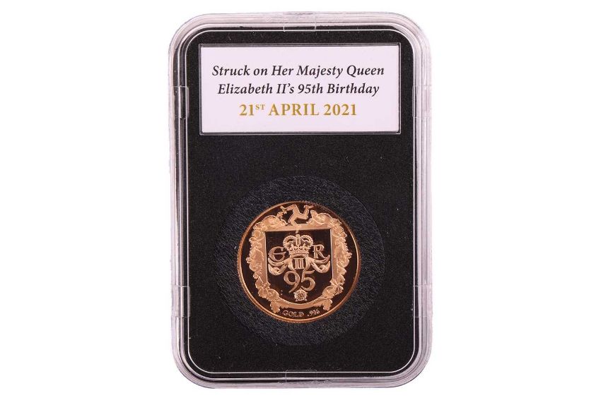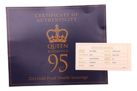 A Queen Elizabeth II Gold Proof Double Sovereign, struck to commemorate her 95th birthday in 2021, 15.98g, Isle of Man issue, in capsule, with outer presentation box and certificate.