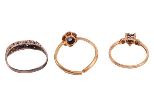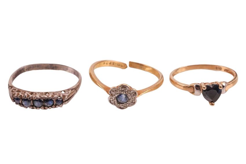 A small group of jewellery, to include a heart-shaped initial pendant on chain, surface testing as 9ct, 41.0cm in in length; a namesake necklace on chain, reading ‘Zoe’, surface testing as 9ct, 41.0cm in length; two locket pendants and a chain, the first of oval form with scrolled detail, the second of heart form with bow detail, both surface testing as 9ct, along with a chain measuring 40.5cm in length, surface testing as 14ct; three sapphire-set rings including a sapphire and diamond flower cluster ring (broken) surface testing as 18ct, a heart-shaped sapphire ring surface testing as 9ct, size J, and a five-stone sapphire ring surface testing as base metal, size D ½; Total weighable 6.0 grams.