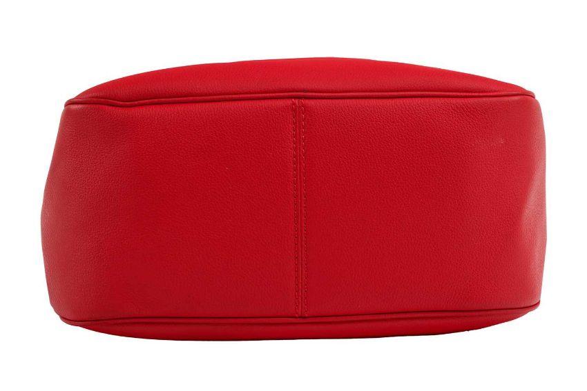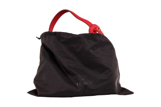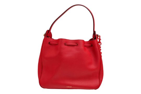 Versace - a La Medusa bucket bag in red calf leather, top drawstring closure, canvas lined, with red resin detachable chain and applied logo, another detachable flat leather strap, gold-tone hardware.