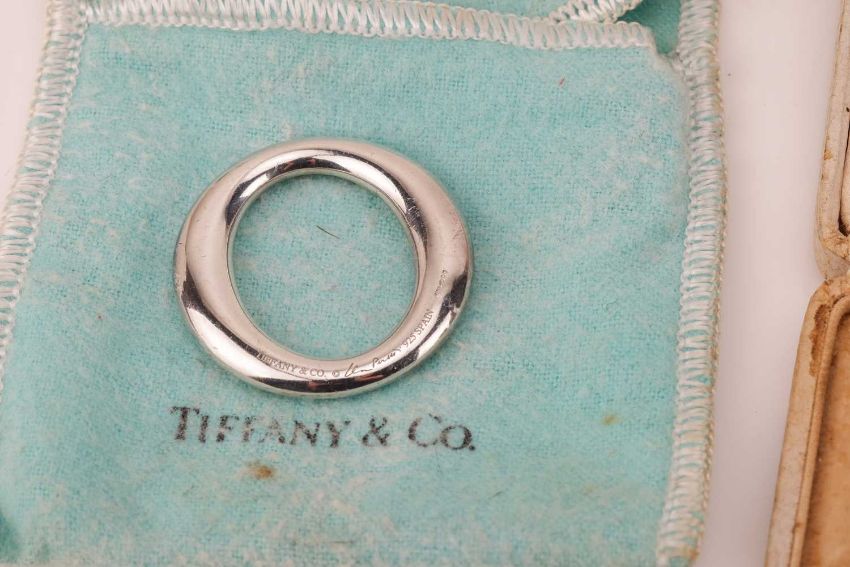 A collection of jewellery; to include an Elsa Peretti for Tiffany & Co. "Sevillana" silver pendant in pouch, a jade and platinum ring, an emerald and cz cluster pendant in yellow metal testing as 18ct, 1.5g, a silver medal topped with a pink metal cartouche testing as 14ct, a hardstone pendant, a carnelian and a lapis-set cross pendant, and a quantity of costume jewellery, together with a gold-filled propelling pencil, a cigarette holder, coins and other items.