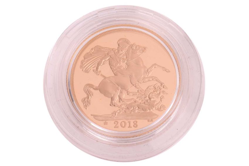 A QEII 2018 Proof Sovereign, in capsule, with outer Royal Mint presentation box and certificate.